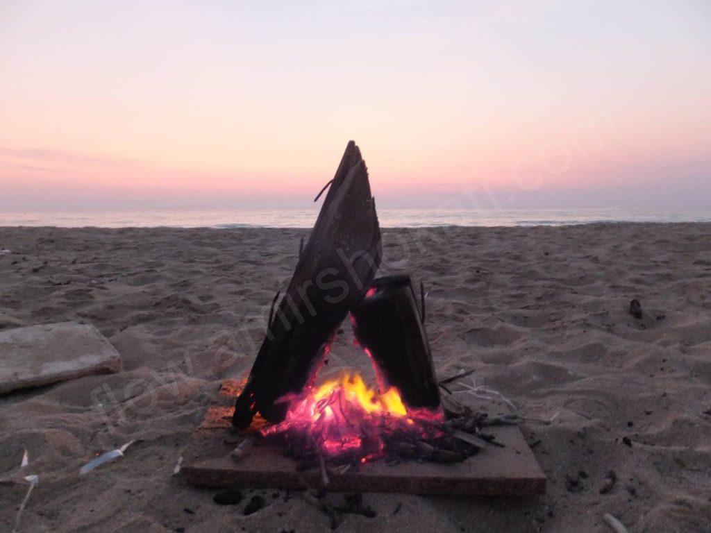 ساعت ۲-۳ ظهر بود که آتیش ریزی ساختم و کنسرو لوبیا گرم کردم. کمی اونورتر از من یه اکیپ آفرود باز و هایلوکسی کمپ عظیمی زده بودند. منم روغن زدم که رنگ بگیرم و یه ساعتی لش کردم. بعدم با ریکا خودمو تو دریا شستم. سفر من ۴-۵ روز قبل یلدا بود در نتیجه حدود ساعت ۶ شب میشد و ۱۲ ساعتی تاریکی بود. یادتون باشه که بساط آتیش رو بهتره قبل تاریکی ردیف کنید. خوشبتانه تو ساحل بنود کُنده و چوب زیاد پیدا میشد و منم آتیش مبسوطی ردیف کردم که همدم تاریکی باشه.